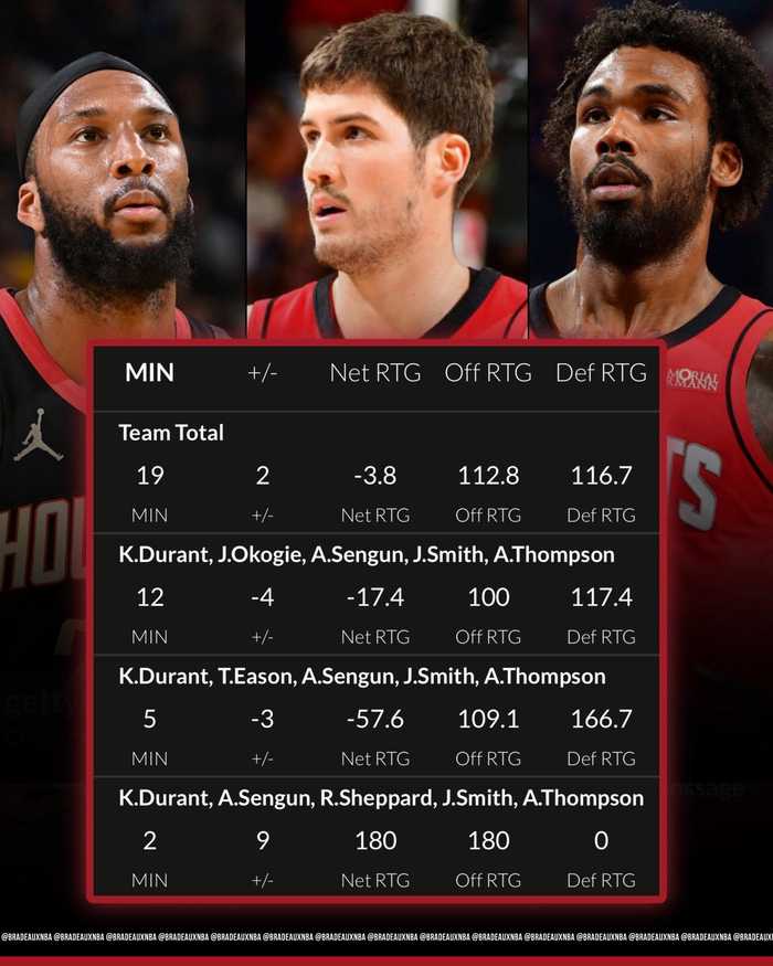本届季后赛,火箭队以阿门、KD、小贾、申京4名首发为固定班底的搭配阵容,相关数据如下: